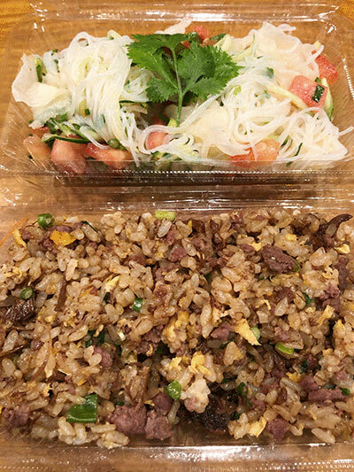 「炒飯」(¥280)と「春雨サラダ」(¥380)、「薬膳湯麺」(¥1,000)、「八種餃子(焼きまたは水)」(¥1,000)。炒飯は日替わりで、この日は鶏の佃煮炒飯。
