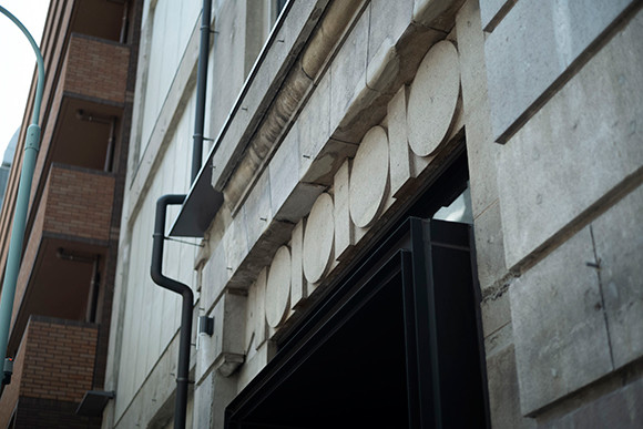 重厚感のあるビルの美しさを守り、大きな看板や目印などを付けていない。ホテルの控えめなプレートが目印。
