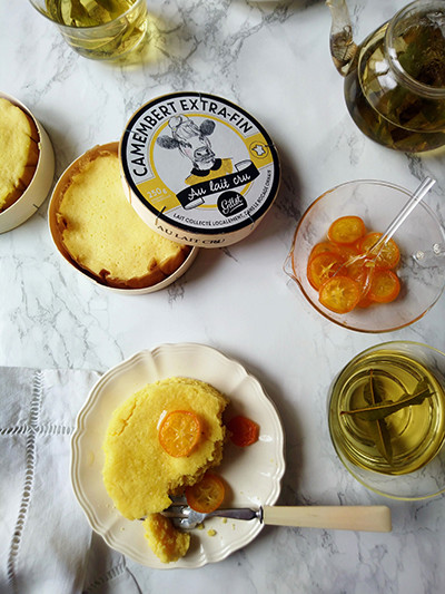 生地を流し込んで蒸した型は、ヴァカンスで行ったドーヴィルのスーパーで買ったカマンベールチーズの入れ物。パリから地方に出かけると、マルシェはもちろん楽しいのですが、必ずスーパーのローカルコーナーへ。その地のワイン、シードル、塩、ハチミツやコンフィチュールなどがおいしく、おもしろいパッケージを発見をするのも楽しみ。気に入ったものは取っておいて、こうして使っています。