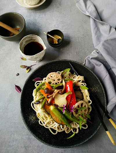 今回は細めのうどんですが、たまに海外暮らしならではの裏技“なんちゃって中華麺”パスタを茹でる時に重曹を多めに入れると、それ風になるので、それで野菜たっぷりの冷やし中華を作っています。