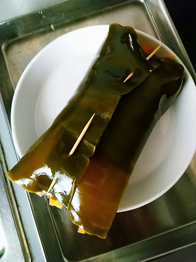 5. 昆布で具材を包み、端を爪ようじでとめる。強火で10分ほど蒸す。昆布を開いて細ねぎをのせ、ポン酢や山椒粉をかけていただく。