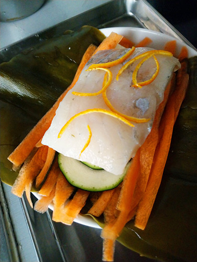 4. ふやけた昆布を広げ、ニンジン、ズッキーニを並べ、豆腐、白身魚、オレンジの皮をのせ、最後に昆布の戻し汁を上からかける。