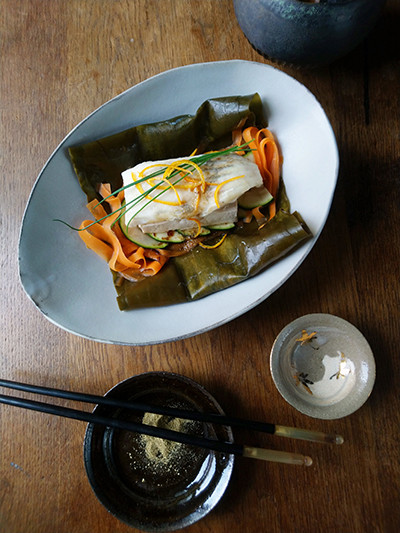 たまたま家にあった冷凍モノを使いましたが、昆布と海の塩と日本酒の旨味のおかげで、こうするとどんな魚も間違いなくおいしくなります。簡単なのですが、ちょっとしたご馳走に見えますね。