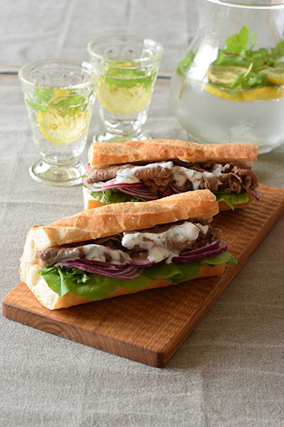 汗ばむ日はスパイシーなものが食べたい!と、ケバブ風サンドウィッチに。牛肉をクミンやコリアンダーなどのスパイスをたっぷり加えたヨーグルトソースで味付けし、ルッコラやアーリーレッド(赤タマネギ)と一緒に豪快にバゲットにはさみ込みました。仕上げにミントが香るヨーグルトソースをかけて。