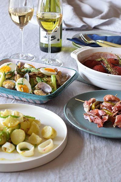 青トウガラシの酢漬けは生ハムと合わせてピンチョスに。イカとジャガイモのサフラン風味のサラダ、白身魚や貝などの魚介類とアスパラガスは辛味の利いた白ワイン煮込みに仕上げました。食後はプラムをローズマリーで香りづけしたグラタンをデザートに。レッスンではアイスクリームを添えようかなぁとあれこれ思案中です。