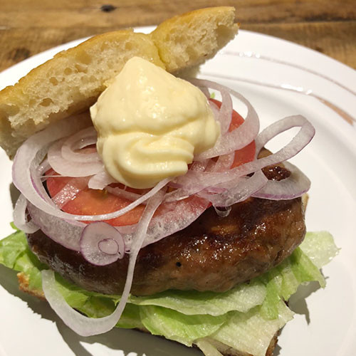 「マグロの照り焼きハンバーグパニーニサンド」¥650。そのほかに「ロースカツパニーニサンド」¥650、「ハンバーグパニーニサンド」¥650、「キレド野菜のパニーニサンド」¥600も。