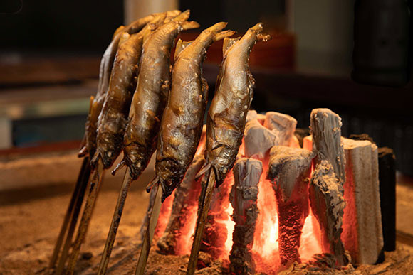 貴重な天然鮎を、炭火でじっくりと焼き上げる。