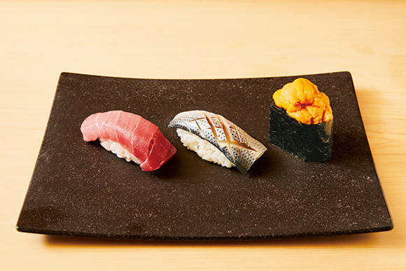 料理はすべておまかせ(¥27,500)から。左から、三厩の一本釣りマグロの中トロ、佐賀のコハダ、北海道のウニ。酢飯の味付けには3種の酢を使用。