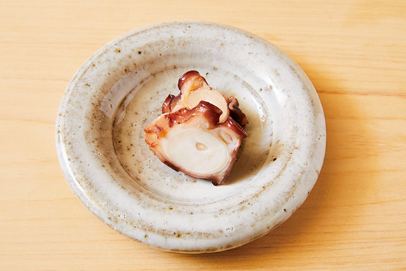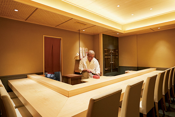 店主は青山の名店、海味で2代目大将を務めた実力者。メニューはなく、席に着くとつまみより先に中トロが1貫供されるのがおもしろい。それは、店主がこだわるマグロのインパクトを打ち出すため。なんでも酢飯の味は、豊洲の名門卸、やま幸から仕入れるマグロとの相性を考えて決めたのだとか。中トロの次に登場するのは、月替りの茶碗蒸しや刺し身などのつまみ8品と、握り11貫。マグロは赤身と大トロも必ず出される。締めのお椀は海味から受け継ぐアラ出汁ベース。追加注文できるカッパ巻も人気だ。