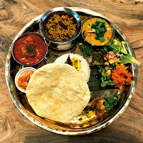 おすすめは店主のスパイス愛が伝わるプレートの一例「マロロガターリー」¥2,750。豆カレー、パパド、マサラウズラなど10種前後が盛られたミールス。ソムリエールが選ぶワインもおいしい。