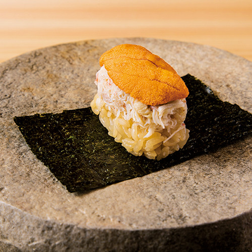 「本格的な江戸前鮨なので、お酒を飲まずとも楽しめますが、ペアリングは楽しさが倍増します」と小松さん。ペアリング付きのコースは¥33,000 毛ガニとバフンウニの握り。