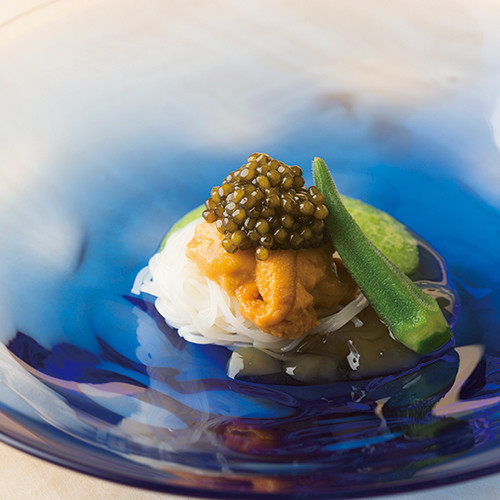 料理はおまかせコース¥30,250のみ。大きなかまどが置かれた店内では、有名店で修業したふたりの料理人が活躍する。コースの後半で提供する「ウニとキャビアのそうめん」