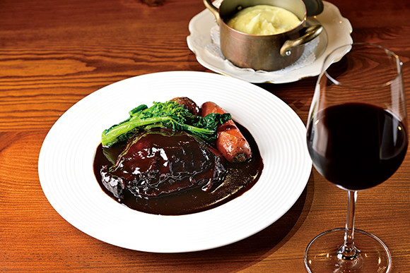 肉をマリネするところから始め、3日かけて仕上げる「牛ほほ肉の赤ワイン煮込み」¥3,740。濃厚な味わいに負けない、ドメーヌ・リショーの「Les Buisserons」(グラス¥1,210)と合わせて。