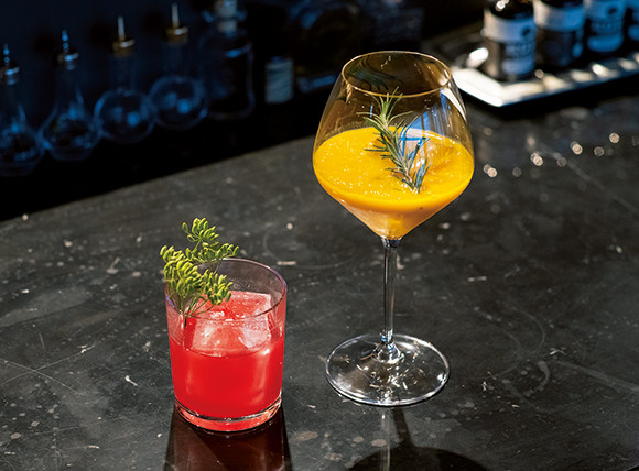 左から、クランベリーとフェンネルなどを使った「フェンネルバージンブリーズ」¥1,200、マンゴーとオレンジにコリアンダーやローズマリーなどを加えた「スパイシーマリー」¥1,200。別途サービス料10%