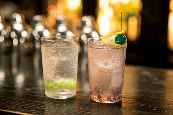 左から、ノンアルコールの「ジントニック」¥900、「バイオレットフィズ」¥900。モクテルはシップのメニューにはのっていないが、リクエストすれば作ってもらえる。