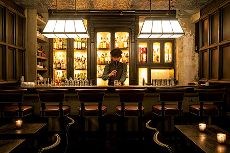 昨秋オープンしたモダンインディアンレストランの姉妹店、グレイルーム。有名ホテル出身のバーテンダーが活躍する本格バーだ。オリジナルレシピのモクテルにはカクテルと同じく、インド産のスパイスや茶葉やコーヒー、斬新なテクニックが駆使されている。スパイシーなナッツなど、インドのおつまみと楽しんで。
