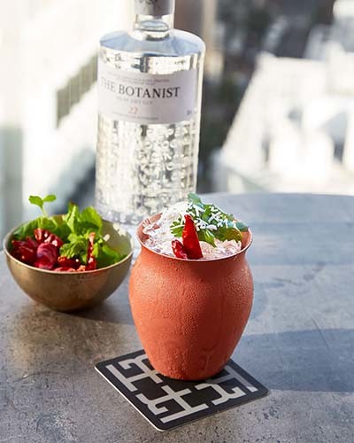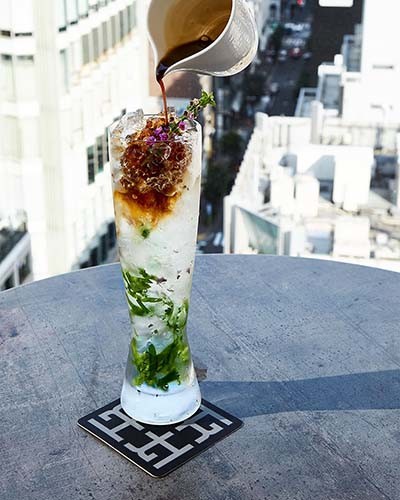 ココナッツウォッシュド ボタニストジン、チリシュラブ、フレッシュライム、カルダモンビターズ、コリアンダーなど、ハーブを効かせて。「グリーンカレーモヒート」¥2,400(サービス料10%込み、税別)