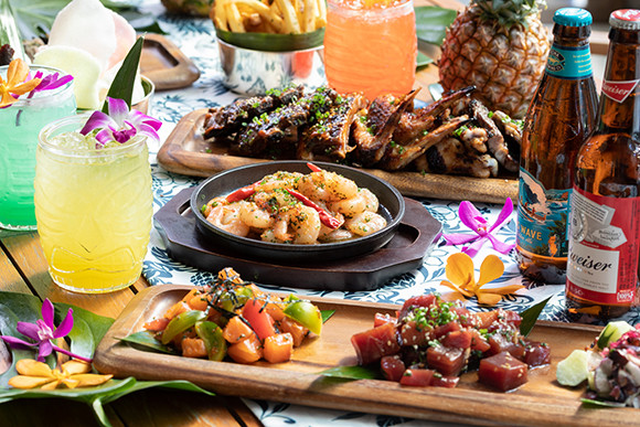 スパイスの効いたグリル料理やポキなど、どれも食欲をそそる。ハワイアンカクテルは、マイタイ、ハリケーン、ブルーハワイを、ハワイの守り神「ティキ」をモチーフにしたグラスで提供。