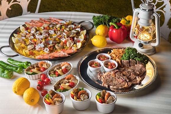 牛肉ステーキやパエリアなど、豪華な料理もうれしい。