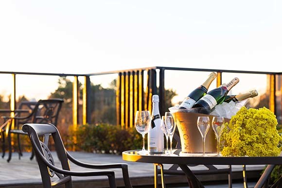 ザ・ルーフ シート&シャンパンセットは、「ジョセフ・ペリエ キュヴェ ロワイヤル ブリュット」のベビーボトル1点とセイボリーペカンナッツのペッパーミックスかガーリックオニオンのどちらかひとつを選べる。
