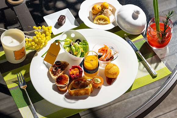 シャンパンガーデン2020ではプロヴァンスをイメージしたオードブルプレートと食後のオリジナルカクテルもいただけるうえ、お土産にはロクシタンで人気の夜用美容液や新製品を含むスキンケアサンプルセットが付いてくる。