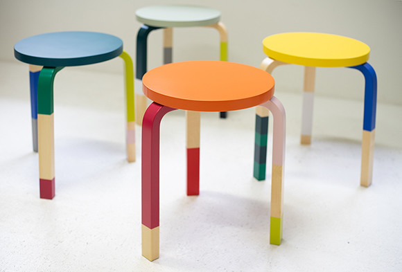 「でも、色柄の激しい北欧のプリント・テキスタイルに興味をもって、のめり込んでいくうちに、アアルトのシンプルな空間やアルテックの家具があるからこそ、ああした色柄のテキスタイルが映えるのかもしれないと思い始めて。そうしたらもう、完全にハマってしまいました……! 私自身の展覧会でも、数年前からカラーリングした『スツール 60』がたびたび登場しています」