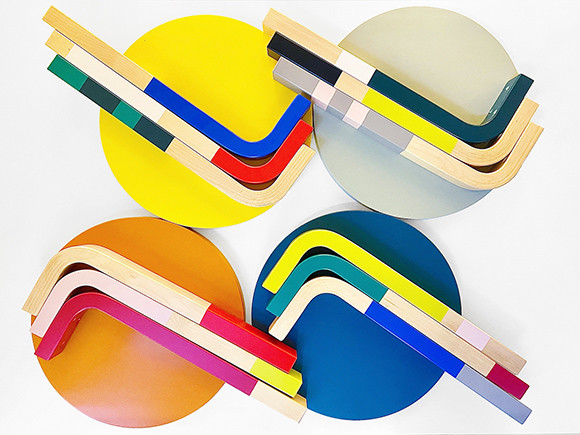アルヴァ・アアルトの1933年のデザイン「スツール 60」。フィンランドのバーチ材を直角に曲げる技術「L-レッグ」が用いられたアルテックを象徴する一脚。その特別バージョンとなる「Artek Tokyo with Masaru Suzuki スツール 60」では、既存のカラーバリエーションより座面カラー4色選び、その色をを活かしたデザインに。40脚限定で販売。各¥43,000(税抜)