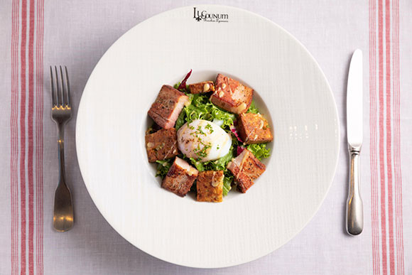 「リヨン風サラダには本来、ベーコン、クルトン、ポーチドエッグが入るのが定番ですが、うちでは、クルトン代わりに自家製のケークサレ、塩漬けの豚バラ肉で作る自家製のベーコンを入れています」とポコシェフ。半熟卵の黄身を潰して、ソースのように全体に絡めて食べれば、ワインが進むこと請け合い。厚切りの自家製ベーコンも存在感たっぷりだ。