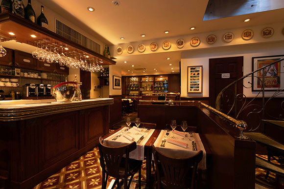 神楽坂の毘沙門天にほど近い路地に、リヨンのブションを思わせる空間が。螺旋階段や、伝統的錫トップのカウンターも本場さながらに再現。