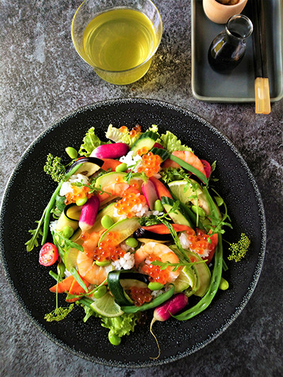 2. 皿に、ちぎったレタスを敷き、酢飯の3分の2を薄くのせる。昆布〆野菜、海老、残りの酢飯を交互にのせていき、イクラ、ルッコラやハーブ、レモン、枝豆、ミニトマトなどを上から散らす。