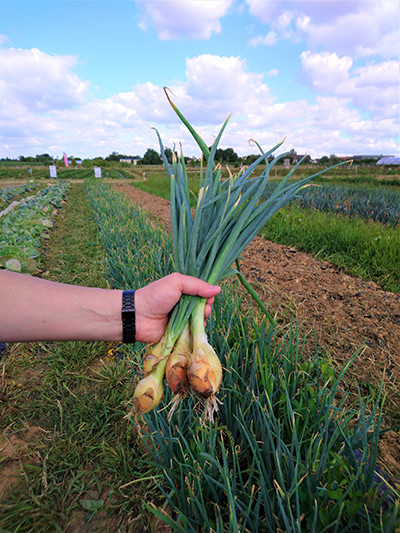 新玉ネギのブーケ! 葉の部分も立派なごちそうなので、ネギ焼き、ネギそば……すぐにメニューが浮かんできてしまう。