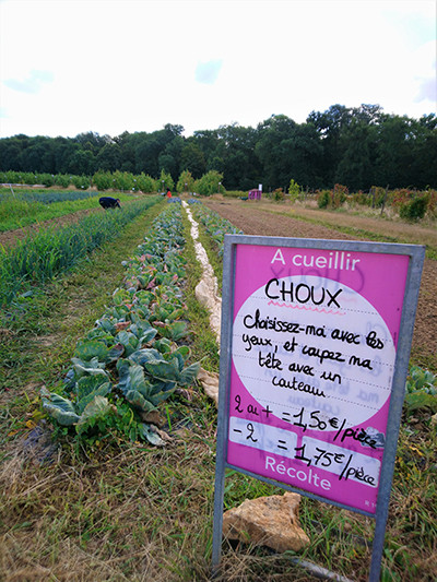 ここの成り立ちは、近くのリミニ―(Lumigny)という村にある4代続く農家に、70年代1組の夫婦が入って仲間入りし、小さなイチゴ畑を作ったのが始まり。86年からは、前回もお伝えした地球環境を守りながら自然農法を実践している収穫農園運営グループ、レ・キュイエット・シャポー・ド・パイユ(Les cueillettes Chapeau de Paille)に参加。そして都会からリターンしてきた2人の息子とともに、この地に農園を拡大したのは10年前。今日では、家族と新しい農業を志す若いスタッフたちで8ヘクタールの畑に50種類の野菜やフルーツ、花を栽培しているということ。