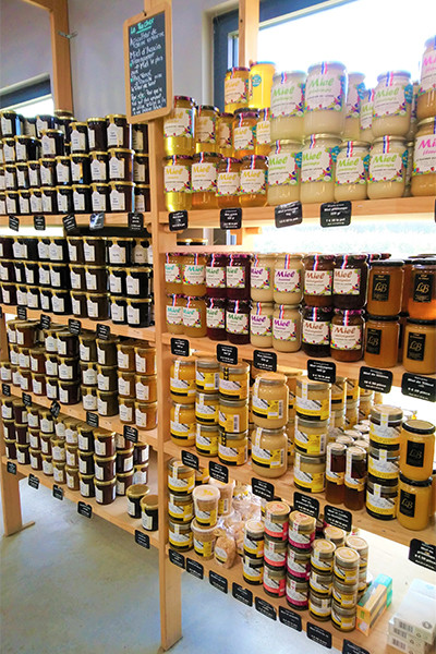畑の入口には、フランス国産のハチミツやコンフィチュール、肉、乳製品などが揃うマーケットが。