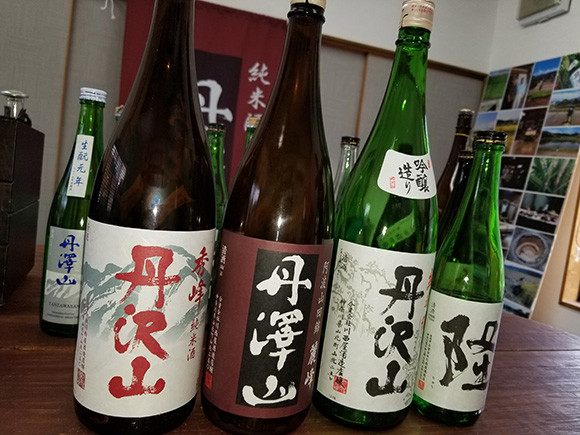 お燗に最適な丹沢山シリーズ、左の「秀峰」はどんな和食にもマッチ。左から2番目の「麗峰」は、ブルゴーニュの赤のようなしっとりとした味わい。スペイン料理や中華料理にもよく合う。右ふたつは、川西屋ならではの地元で取れた酒米「若水」を使用。