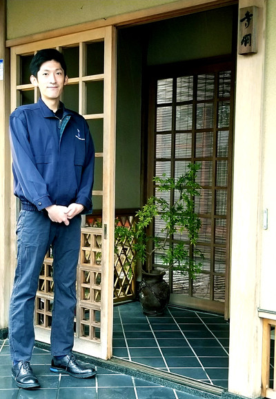 専務の寺岡智之さん。180㎝を越す身長に、長い手足のモデル体型で颯爽と作業服を着こなす(ので私服に見える……) 。
