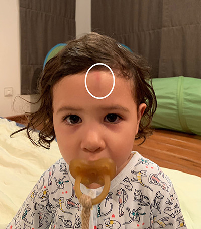 おでこにたんこぶを作った夜、イモーテル(ヘリクリサム)オイルをつけた後。