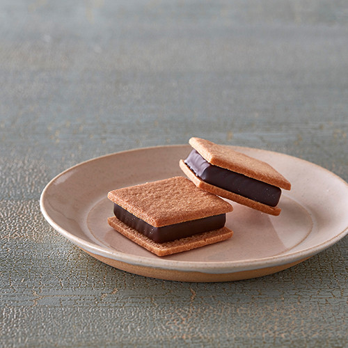 福井の昭和8年創業の和菓子店、森八大名閣が手がけるチョコレート専門店の「生チョコサンド」。福井市山奥町の自然豊かな自社の工房で、カカオ豆の選別、焙煎、さらに1週間かけて豆をひき細かくしていくなど丁寧なビーントゥバーの工程を経てつくられるチョコレートは、ガーナ産のカカオ豆ときび糖のみが原材料。それにクリームを加え、究極のなめらかさを追求したガナッシュを、バターが香るサクサクのクッキーとともに味わえば、ひと口ごとにチョコの優しい甘さがゆっくりとろけ、カカオの香りが口いっぱいに広がる。