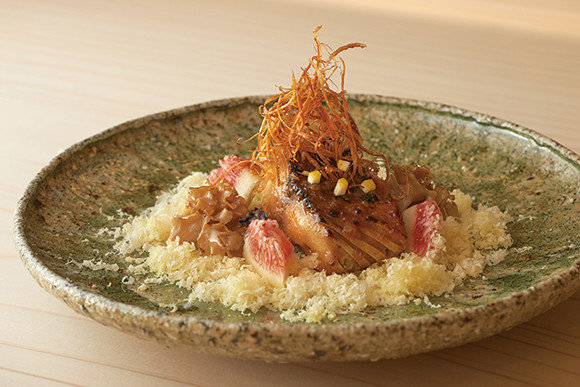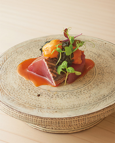 カツオといえば“たたき”が常套。それにひと捻りを加え、和食店ならではの味に仕立てたのは荻野聡士店主。今年オープンの同店で腕を振るう期待の新星だ。「脂がのり、もっちりとした食感の戻りガツオは藁で炙った後、バフンウニと卵黄ソースを添え、より爆発力のある旨味を引き出しました」と店主。いっぽう、初ガツオなら薬味を合わせ、さっぱり仕上げるなど、素材への確かなアプローチから生まれる一品は緩急の付け方も見事。いま、最も注目すべき一軒だ。