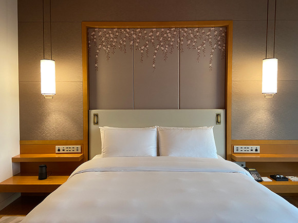 「しだれ桜」を刺繍したヘッドボードや墨の筆遣いを描いたカーペットは、ホテルが立地する日本橋らしい「和」を思わせる設え。竹を使用した床は裸足で歩きたくなる。