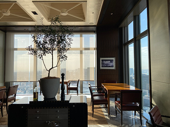 大きな窓から眺める都会のパースペクティブは、非日常感たっぷり。天候によっては、大きな窓から富士山を眺めることも。