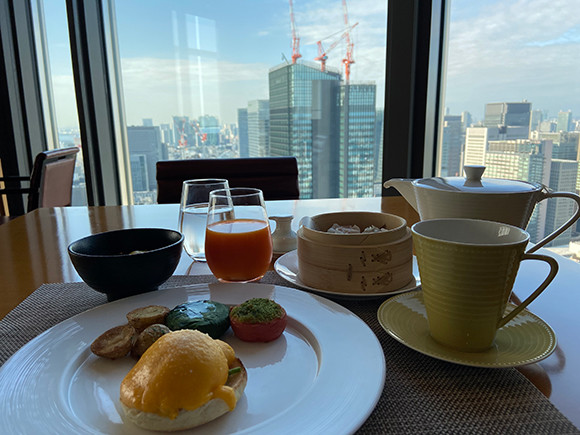 朝食は、部屋でセットメニューをいただくか、37階の「ケシキ」で。以前は、ブッフェスタイルで提供していたが、現在は、メニューからメインは1品、ほかは好きなものを好きなだけオーダーするシステムに変わった。山梨県の中村農場産の特選ハーブ卵を使ったエッグベネディクトなどの卵料理や、一口サイズの香港細麺の雲呑麺。ホテルならではの朝食メニューを香り高いお茶とともにいただくと、新しい1日への活力が湧いてくるようだ。