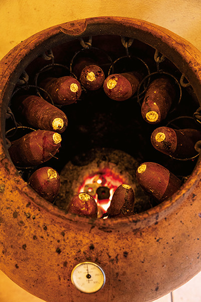 9月頃に収穫した紅はるかを貯蔵&熟成。甘味を引き出したサツマイモを、常滑焼の壷に入れた備長炭でじっくり焼き上げるのがこの店のスタイルだ。その甘さは、ヘタの切り口からあふれる蜜を見れば一目瞭然。“ホクホク”としたイメージが強い焼きイモだが、蜜が多いため、ねっとりとした食感にきっと驚くはず。