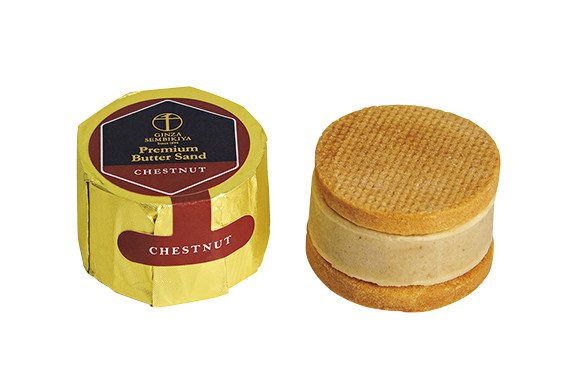 老舗フルーツショップによる新機軸。喫茶を擁する店内では、最上級の果物や、それらを使ったスイーツが並ぶ。新定番として注目なのが、オレンジやラムレーズンといった10種の「プレミアムバターサンド」だ。和栗フレーバーは、バター、渋皮栗のペースト、栗の実がバランスよくサンドされ、コクのある芳醇な味に仕上がっている。