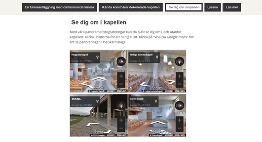森の墓地の公式サイトでは、チャペル内のパノラマフォトが公開されている。「Om Platsen(場所について)」のページの「Se dig om i kapellen(礼拝堂を見る)」からアクセスを。