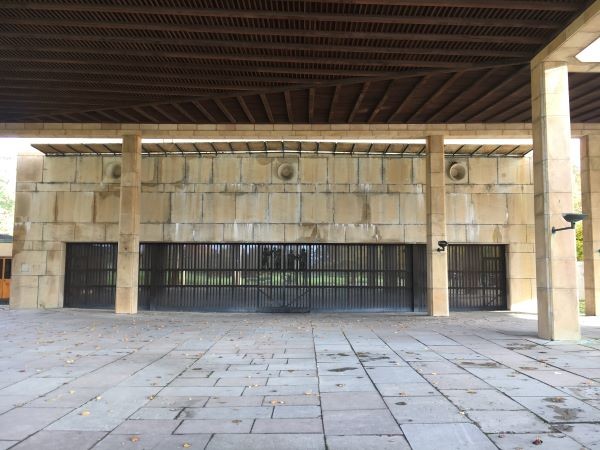 火葬場の外壁。中心の黒い柵が開閉され、葬儀後は外の光へと導かれる。