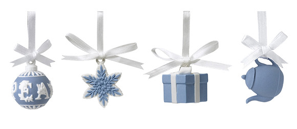 「ホリデイ アドベントカレンダー」に入っているミニオーナメント。写真左から:小さな球体に「PEACE」の文字が描かれたピース、氷の結晶をイメージしたスノーフレーク ブルー、クリスマスプレゼントを連想させるブルーボックス、丸みのある形が可愛いティーポット。