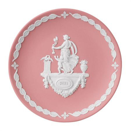 ジャズパーピンクのやわらかな色合いが、インテリアに温もりを醸し出す。「ジャスパー イヤープレート 2021」はプレートスタンド、ハンガー付き。(Φ17cm)¥13,200/ウェッジウッド