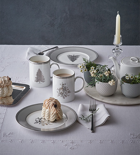 やわらかな乳白色と洗練された白金で彩られた「ウィンターホワイト」。その佇まいを生かして色を抑えたテーブルコーディネートにすると、クリスマスの神聖な雰囲気が漂う。写真手前から時計回りに、「ウィンターホワイト 20cmプレート ヒイラギ」¥4,400、「ウィンターホワイト マグ ヒイラギ」¥4,400、「ウィンターホワイト マグ ツリー」¥4,400、「ウィンターホワイト 20cmプレート ツリー」¥4,400、「ジャスパーフォリア ミニポット (シャドーグレー、パウダーピン ク、ドーブグレー) 」各¥3,300、「ジオ ティーポット」¥6,600/以上ウェッジウッド