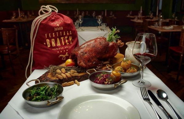ベルリンの老舗レストラン、Joleschの、ロックダウン・テイクアウトメニューにもガチョウが!すごい迫力。お腹に栗やハーブなどを詰められたガチョウは、野菜と一緒にじっくりグリルされる。