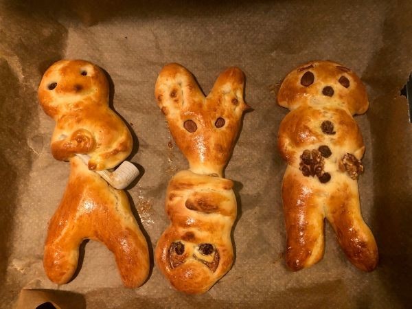 聖マルティンの日のもうひとつの名物が「ヴェックマン」と呼ばれるパン。「ヴェックマン」以外にも、「マルティンスブロート(マルティンのパン)」などと地方によって名前が異なるが、人型のパンで手にパイプや木の枝を持っているのが特徴だ。もともと聖マルティンを象ったものなので司教が持つ杖を手にしていたが、後にその意味が失われパイプになったという説がある。ブリオッシュのようにバターがたっぷりのパンは、ほんのり甘く、やわらかい。